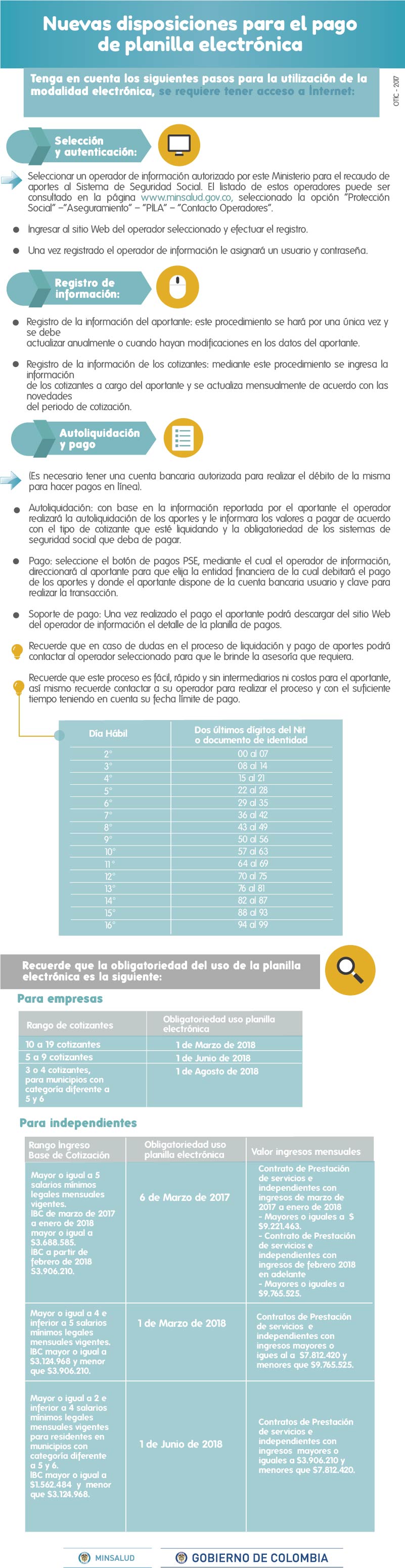 Bogotá, 31 de enero de 2018.- A partir del 1 de marzo de 2018, los aportantes que tengan a su cargo diez (10) o más cotizantes; y los trabajadores independientes cuyo ingreso base de cotización sea mayor o igual a 4 salarios mínimos legales mensuales vigentes ($3.124.968) deberán realizar de manera obligatoria el pago de los aportes al Sistema de Seguridad Social Integral y Parafiscales únicamente mediante el uso de la Planilla Electrónica, como lo establece el Decreto 1765 de 2017 del Ministerio de Salud y Protección Social.
