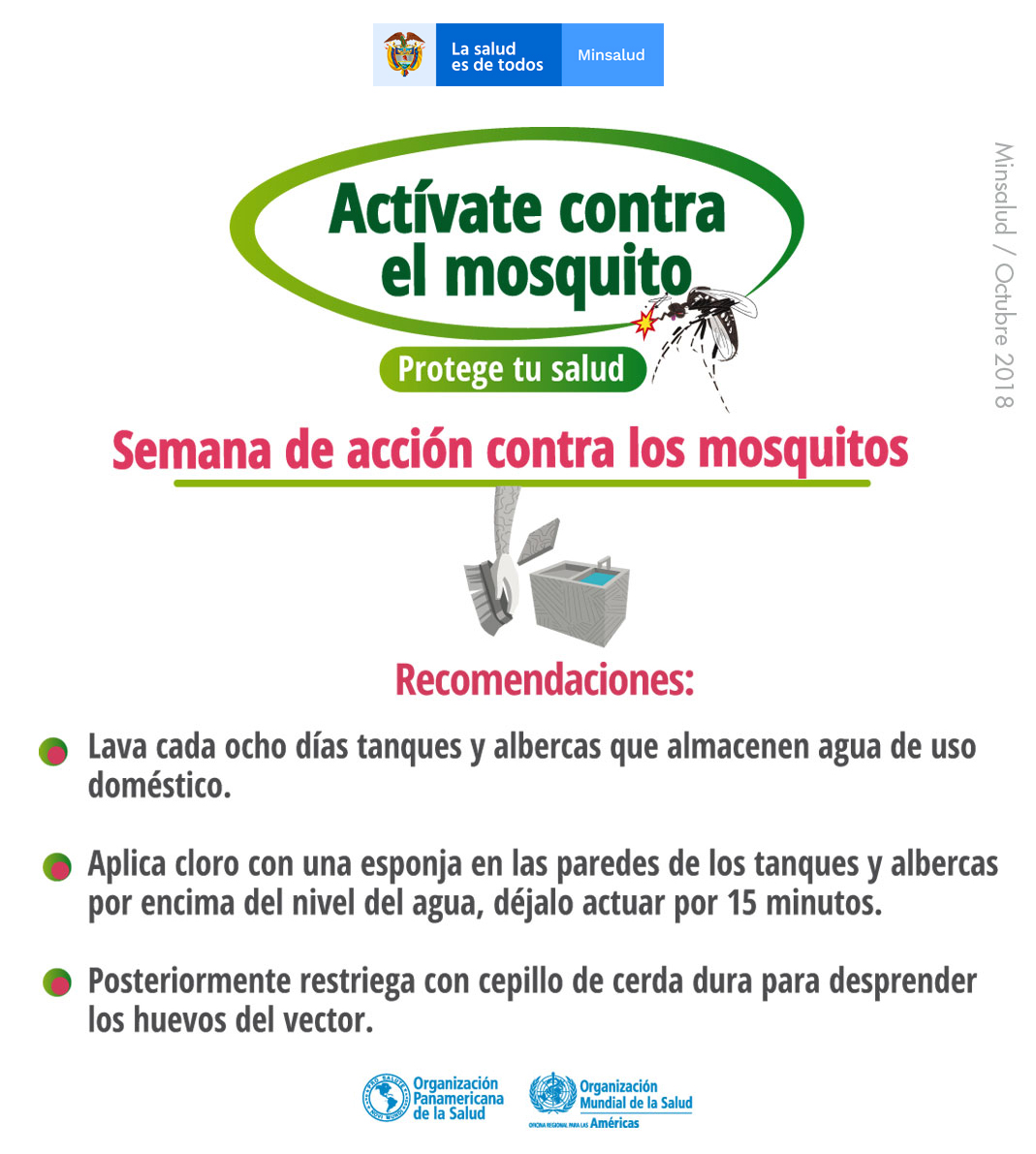 - Si almacenas agua en albercas, canecas u otros recipientes grandes, lávalos y cepilla las paredes de las mismas cada 8 días, de ser posible manténlas tapadas